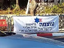On 19 July, the party requested a permit from police to organize a march in Umm al-Fahm.[108][109] On 21 July, the party distributed food to security forces in Jerusalem.[110] On 23 July, dozens of party members demonstrated outside of the Prime Minister's Office in Jerusalem in the evening; the demonstrators called upon Defense Minister Avigdor Lieberman to resign.[111] On the evening of 24 July, their party blockaded a junction just outside Nablus, preventing both the entry and exit of Palestinians.[7] On 24 September, the party's planned conference in Lod was cancelled by orders of the Lod City Hall; it was instead held in Gandhi Garden.[112][113] After it was rescheduled, the party's leader, Michael Ben-Ari, released a video calling for Arabs to leave Israel and move to Arab countries. The conference was condemned by the Coalition Against Racism in Israel.[114] On 1 November, the party put up billboards for the memorial of Meir Kahane, though the billboards were taken down after pressure from left-wing lawmakers, as well as NGOs.[15] On 4 December, in protest of stone-throwing against a group of Jewish children,[115] activists from the party announced that they would hike to the same cave that the kids went to.[116][117]
