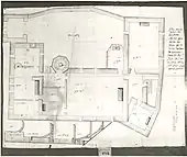 The southeast wing probably had a basement, a ground floor, a first floor and an attic. It measured about 10.30 by 6.6 meters. On the southwest corner was the Dievetoren, which also had small overhanging towers. The western wall, which was part of the main building, was 25.5 m long, and had an octagonal stair tower on the courtyard side. The main floor of the main building was about 1.2 m above the courtyard. Below it was a basement.[9] On the north west side was another structure.