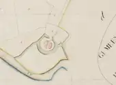 The first written reference to the Oud Herlaer Castle dates from when it was sold in 1315.[4] The first depiction of the castle dates from a painting made by Pauwels van Hillegaert in 1631, depicting the 1629 siege of 's-Hertogenbosch. It shows the castle from such a distance that it's not useful.[7] The eighteenth century pictures are better, but not conclusive. They often show a round stone ring wall with a roof. A 1735 floor plan by Hendrick van der Beck, and an etching by Hendrik Spilman show this as a more polygonal structure.