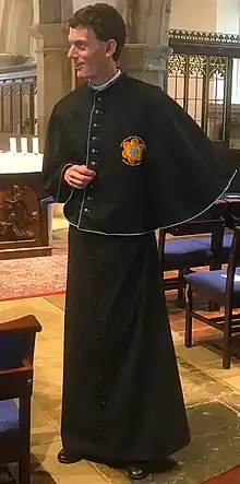 The original shrine at St Mary's Church is administered by the parochial church council, working in close cooperation with the Chapter of Our Lady of Willesden. The day to day direction of the Companionate is in the hands of a chapter of capitular priests (usually numbering six, of whom the vicar of St Mary's, Willesden, is a member ex officio), and laity (of whom the churchwardens of St Mary's are also ex officio members). Chapter priests of Our Lady of Willesden are distinguished by a black mozzetta with pale blue buttons, piping of blue and gold, and the seal of Our Lady of Willesden embroidered on the left breast.[5] Lay members of chapter are distinguished by a pale blue collarette from which the shrine badge is displayed.