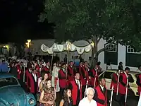Nowadays, the celebration of the Palm Sunday, as well as the other celebrations, follow the rite promulgated by the Second Vatican Council, and begins at the windows of the Church of Our Lord of Bonfim. Upon arrival, the priest greets the people in the usual way, recites the prayers, and sprinkles the branches with holy water. The proclamation of the Gospel is made and then the procession is announced. At the beginning of the procession, immediately in front, goes the acolyte with the lighted thurible, and then, according to ancient local custom, the cruciferary, a Brother of the Blessed Sacrament with the ornamented cross; two Brothers leading the lanterns forming the wing of the faithful on the sides of the street in single line. In the center, the youth group of the Stations of the Cross Pastoral, followed by the guild of the Brotherhood of the Blessed Sacrament with the parish priest, accompanied by the Phoenix Band that performs the traditional dobrados and festive marches from its repertoire. When the priest arrives at the Mother Church, where the altar for the outdoor mass is located, he continues the celebration in the usual way, without the presence of the traditional choir and orchestra. On Palm Sunday evening and Holy Monday, the other celebrations of the Feast of the Steps take place.[42]