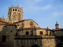 The earliest cathedral in Ourense appears to have been the church dedicated to Santa María la Madre. In 550, the Suevian king Chararic built a second church dedicated to St Martin of Tours on the site of today's cathedral of the Auriense diocese. It was also the time when the arch bridge opposite the cathedral was built over the river, facilitating access to the thermal springs. The cathedral was however repeatedly destroyed over the centuries by the Moors and the Northmen who invaded the city. Today's building was constructed as a Romanesque church in the 12th and 13th centuries. Construction was supported by Bishop Lorenzo, who also built the new Ourense bridge and the bishop's palace.[4] Gothic additions followed until the early 16th century.[4] There is little historical documentation on the construction of the building but there is a clear record mentioning the consecration of the high altar in 1188.[5][6]
