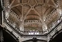 The cathedral plan takes the form of a Latin cross, the nave being flanked by slightly lower lateral aisles. It measures 84 m (276 ft) in length and 43 m (141 ft) across the transversal transept. Completed in 1505 by Rodrigo de Badajoz, the octagonal Gothic lantern tower with its three levels of windows rises above the point where the transept crosses the nave.[7] The former apse was later converted into an ambulatory bordered by a series of chapels including the 15th-century St John's Chapel (Capilla de San Juan) and the 16th-century Chapel of Snows (Capilla de las Nieves). After the chancel had been demolished in the 20th century, the choir stalls were moved into the body of the church and into Christ's Chapel.[8]
