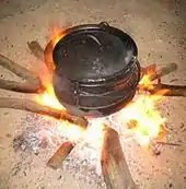 Backwood cooking is a method of cooking without the use of kitchen implements.[4] It commonly takes place in the backwoods, often in combination with wild or conventional camping. Some variants of backwoods cooking allow the use of items of cookware such as a cooking pot;[5] however there are many recipes without any. Some backwoods alternatives to cookware include aluminium foil,[4] fruit skins,[6] and heated stones.[7] Traditionally backwoods cooking takes place over a wood-burning fire because wood is the most available fuel source in the backwoods.[8] As a result, some recipes include information about the intensity of the fire to be used.[6]
