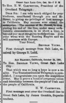 Once the line had been completed to Salt Lake City, the first messages were sent on the evening of October 24, 1861. At 5:13 pm (Salt Lake City time), James Street sent the first message to California from Utah Territory. It was addressed to company president Horace Carpentier, advising him the line was complete and to go to the nearby telegraph office. Less than two hours later, Brigham Young, President of the Church of Jesus Christ of Latter-day Saints, sent the next message. Also addressed to Carpentier, this congratulatory message received a response, resulting in the first back-and-forth communication between San Francisco and Salt Lake City. Shortly thereafter, a message was forwarded to San Francisco informing them that Colonel Edward D. Baker—a former politician in California—had been killed at the Battle of Ball's Bluff a few days prior. News of this event put a damper on the celebrations surrounding the telegraph's completion.[5] Later that evening, messages were also sent from California to Abraham Lincoln, President of the United States at the time.[6][7]