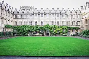 The main buildings are located in the centre of Oxford, between Turl Street, Ship Street, Cornmarket Street and Market Street. The main entrance is on Turl Street. The buildings are arranged in three quadrangles, the first quadrangle containing the oldest college buildings and the third quadrangle the newest. The foundation charter gave to the college a site between Market Street and Ship Street (which is still occupied by the college) as well as the buildings of a defunct university academic hall on the site, called White Hall.[40] The buildings that now surround the first quadrangle were erected in stages between 1571 and the 1620s; the principal's lodgings were the last to be built. Progress was slow because the new college lacked the "generous endowments" that earlier colleges enjoyed.[41] Before new buildings were completed, the students lived in the old buildings of White Hall.[42]