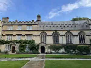The third quadrangle from the steps of the Old Members' Building looking east; the Ship Street entrance is through the archway on the left; the spire in the distance is the chapel of Exeter College.