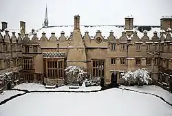Snow in Jesus College's second quadrangle (21st century). The second quadrangle was constructed between about 1640 and about 1713