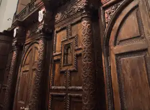 Wood paneling detail dating to the early 1600s in the Jesus College Oxford dining hall. The hall, like the chapel, was largely built by Griffith Powell between 1613 and 1620, and was finally completed soon after his death in 1620.[50] A wooden paneled screen (depicted) was installed in 1634.