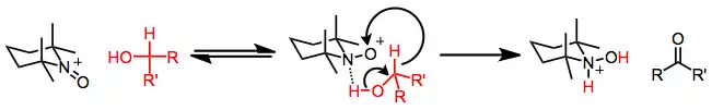 Under neutral or slightly acidic conditions (in the presence of silica gel, for instance), oxidation occurs by an initial hydrogen bond between the hydroxyl group and the oxoammonium nitrogen, followed by concerted proton transfer and hydride abstraction.[5] The need for hydrogen bonding is supported by the low reactivity of β-alkoxy and β-amino alcohols, which exhibit competitive intramolecular hydrogen bonding. The mechanism of oxidation under weakly basic (pyridine) conditions is similar, except that pyridine neutralizes the hydroxyammonium species, and this intermediate "comproportionates" with oxoammonium salt to give nitroxide radicals and pyridinium salts (see equation (3) below). Because this reaction consumes base and active oxidant, two equivalents of base and oxidant are necessary under weakly basic conditions. A unified mechanism under neutral and basic conditions in presented in a recent article.[6] The authors present a comprehensive analysis of a number of oxoammonium salt mediated oxidations.