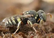 Oxybelus is a genus of wasps in the family Crabronidae. The species are found worldwide except in the Australasian realm. They are especially represented in the Palearctic. Oxybelus is the largest genus in Crabronidae, with 264 species known.[1] Oxybelus wasps sometimes gravitate towards people, flying around travellers and landing on them, even when they are shooed away. It is not known why they do it, however it might possibly be them trying to drink sweat for its minerals.