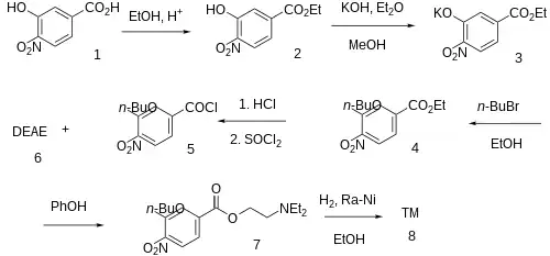 The nitration of 3-hydroxybenzoic acid [99-06-9] (0) gives 3-hydroxy-4-nitrobenzoic acid [619-14-7] (1). Fischer esterification with ethanol gives ethyl 3-hydroxy-4-nitrobenzoate [717-01-1] (2). The phenoxide ion was then prepared from potash (3). Alkylation with 1-bromobutane supplied ethyl 3-butoxy-4-nitrobenzoate, CID:13346201 (4). The product is crystallized from hydrochloric acid, and then halogenation with thionyl chloride gives 3-butoxy-4-nitrobenzoyl chloride [23442-21-9] (5). Esterification with diethylaminoethanol [100-37-8] (6) gives 2-(diethylamino)ethyl 3-butoxy-4-nitrobenzoate, CID:13346204 (7) Lastly, catalytic hydrogenation over Raney-Nickel completes the synthesis of Oxybuprocaine (8).