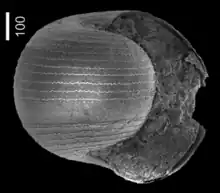 In the largest available specimen from Pliocene of Philippines, the teleoconch has one complete whorl, widening rapidly, which makes the shell about twice as wide as high.[1] In this specimen the apertural margin is irregularly broken, indicating that the teleoconch might even have more than one calcified teleoconch whorl in complete specimens.[1] In another specimen from Philippines (H = 1.60, W = 2.52 mm), the teleoconch has three quarters of a whorl.[1] On the post-larval shell a vague spiral ornament is present and the peripheral belt remains visible as a slightly produced zone reaching the apertural margin.[1]