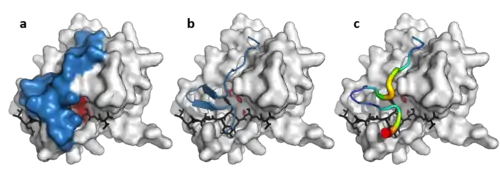 In addition to the double β-barrel core, some viral proteases (such as TEV protease) have a long, flexible C-terminal loop that forms a lid that completely covers the substrate and create a binding tunnel. This tunnel contains a set of tight binding pockets such that each side chain of the substrate peptide (P6 to P1’) is bound in a complementary site (S6 to S1’) and specificity is endowed by the large contact area between enzyme and substrate.[11] Conversely, cellular proteases that lack this loop, such as trypsin have broader specificity.