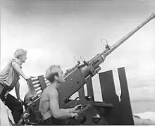 On Tulagi Island, under Kennedy's supervision and with his help, PT-59 had all four of her torpedo tubes removed, as well as her two depth charges, and was converted into a more powerful gunboat, and re-designated as PTGB-1.[10] She retained two heavy 40-millimeter Bofors cannon anti-aircraft guns now fitted fore and aft. The refit also added six .50-caliber machine gun nests, with three on each side, behind shields. Shielded twin fifty caliber machine guns were placed behind and on each side of the cockpit elevated on circular mounts, and by some accounts, 2 additional thirty caliber machine guns forward of the cockpit in the front of the boat on each side. The higher caliber guns were added to increase range and power and to make the 59 more effective against both Japanese barge traffic, which had powerful guns, and heavy caliber Japanese land and shore based garrisons. Admiral William Halsey and other high ranking naval officers had concluded that the torpedo tubes and Bliss–Leavitt Mark 8 torpedoes assigned the old PTs, were highly unreliable and inaccurate; the torpedoes very rarely hit their mark against larger craft, particularly Japanese destroyers and cruisers. The new PT gunboat was given slightly higher quality radar, and a taller radar mast that could, in theory, boost reception and transmission to 75 miles (121 km).[11] Kennedy lived on the boat during its refit, and worked extremely hard according to Lieutenant Alvin Cluster, who stated, "I never saw a guy work harder, longer hours". Kennedy's gunboat, sometimes referred to as PT-0001 was the first completed, and it carefully followed the design and planning of both Kennedy and squadron commander Cluster.[12] Another PT gunboat was given to Lenny Thom, who helped in the refit, and later commanded. Thom had been Kennedy's former executive officer on PT-109.[2]
