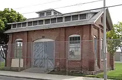 Pacific Electric Railway's Santa Ana substation #14 was built in 1907 and still stands. It is a single-story, rectangular building made of brick with minimal classical ornamentation in its design. There are hollow pipes at each end for electric wires to enter and exit. Very high voltage alternating current (AC) from the Watts Steam Generating Station (30 miles [48 km] away) entered at one end of the building and was converted (by rectification by a six foot high massive rotating machine called a rotary converter) to 600 volts direct current (DC) necessary to power the interurban trains, and the DC wires then exited the building at the opposite end. A transformer was located inside the building to drop the high voltage (delivered from Watts) to a lower voltage AC for the rotary converter.[3] This substation powered the Watts–Santa Ana Line, the Santa Ana–Orange Line, and the Santa Ana–Huntington Beach Line and was in service from 1907 until the cessation of passenger service in 1950. It is the last former Pacific Electric substation building remaining in Orange County.[3]