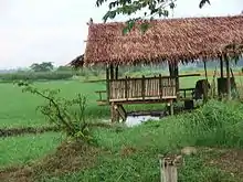 A damara is a Tagalog word for a shelter or a shed made of bamboo and nipa that was built on ricefields as a protection for farmers from the sun or rain during planting and harvesting seasons.[2] Farmers and landlords particularly in the city of San Jose many years ago are building this shelter before the planting season and they demolish (ginigiba) it after the harvest time as they celebrates together for the bountiful harvest. This is where the word Pagibang Damara (shed ready to be demolished) was adopted by the people of San Jose City, Nueva Ecija as they celebrates and gives thanks for their good harvest.[3]