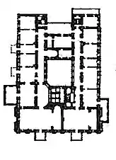 On the second floor of De Boure's palace, there are two separate lounges oriented to front facade which was designed for ceremonial receptions. Long, straight corridors on the right and left sides of the building plan connect the entire room with an enfilade system. The lounges are large and decorated with columns on the side parts on transverse walls. This was one of the methods the architect N.A von der Nonne preferred.[12] Including three-dimensional round columns that stand apart from the structure of the hall enriches the interior of the decorative plastic. The semi-ringed wall cavity, close to the columns and the floor of the hall, creates soft and cozy atmosphere with large arches. N.A von der Nonne often used such architectural elements in the interior of his residential buildings. The presence of mirrored steam next to the column also indicates the new shape applied on the interior.[6]