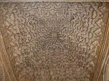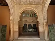 One feature of the palace that was innovative at the time was the presence of a domed chamber at the middle of the north side of the courtyard, aligned with the courtyard's short axis. This square chamber is covered by a large muqarnas vault ceiling and is flanked on three sides by smaller rectangular side chambers or alcoves. The northern alcove features three large windows that start near ground level and a row of four small windows above, all of which would have originally granted sweeping views of the gardens and landscapes beyond. The decoration of this space, which dates to the time of Muhammad V, consisted of carved stucco (partly preserved) and, originally, some zellij or tile decoration along the lower walls (not preserved). A partially-preserved poem inscribed along the windows refers to this chamber as a bahw (Arabic: بهو), a word equivalent to the Spanish term mirador (meaning a lookout point), which went on to be a hallmark of Nasrid architecture.[3] This is one of the most notable Nasrid remains in the building today and it is here that Queen Isabella was first buried.[3][5]