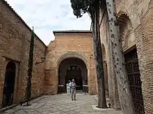 The church's bell tower, built in 1787, stands next to the entrance. A Roman-era stone used in its construction was discovered during restoration works and moved to the city's archeological museum.[6] On the west side of the church is the cloister which in its current form is roughly contemporary with the 18th-century tower, according to Torres Balbás.[6] The cloister consists of a courtyard surrounded by a two-story gallery. The square courtyard occupies a part of what was formerly the elongated main courtyard of the Nasrid palace and the water canal of that palace once ran across the middle of this court. The arches of the cloister's galleries have Baroque-style decorations and Tuscan-style columns.[6] The fountain at the cloister's center dates from the end of the 15th century.[6]
