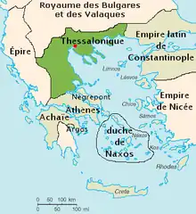Theodore I's successor as Marquis of Montferrat, his son John II Palaeologus, attempted to take advantage of the Byzantine civil war of 1341–1347, between Andronikos II's great-grandson John V Palaiologos and John VI Kantakouzenos, in order to invade the empire and conquer Thessalonica. In his 1372 will, John II claimed that Andronikos II's deposition in 1328 by his grandson Andronikos III Palaiologos (John V's father) had been unlawful and thus disqualified Andronikos III and all his heirs from the legitimate line of succession to the throne of Byzantium. John II also pointed out that since Andronikos II had disinherited Andronikos III, John II was thus the rightful emperor as the only true heir to Andronikos II.[11] John II even petitioned the Papacy to recognize his claims to Thessalonica and to the empire, and to help him conquer them.[13] An expedition to "recover" these territories was never organized.[8] Although John II's claims were theoretically inherited by his descendants, none of the marquises seriously pursued a policy of taking over the Byzantine Empire, most of them paying little attention to affairs in the East.[14]