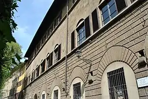 Part of the site was once occupied by the Palazzo Larioni de' Bardi, and the ancient hospital of the Church of Santa Lucia dei Magnoli. From various buildings, a larger domicile had been constructed by 1283. At this early palace was born Eletta de' Canigiani, the mother of Petrarch.[1] In 1465, the bankrupt Bardi sold the palace to the Canigiani.[2] Between 1819 and 1838, Tommaso Giugni, who had married the last heir of the Canigiani, refurbished the structure, both the interiors and facade, in a neoclassical style. That reconstruction included the destruction of a 17th-century fresco depicting an encounter between Saints Dominic and Francis that occurred in the hospital. However, there is no historical documentation of this encounter.