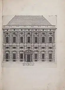 In the construction of the palazzo, Bergamasco, already active in his home town as a decorator and fresco painter, proceeded simultaneously and coherently with the decoration of the external and internal surfaces. The clarity of the façade is Renaissance and of clear Alessian influence, with ashlar cladding in final stone on the ground floor, and pilasters of Ionic order on the first floor that harmoniously mark the façade.[2]