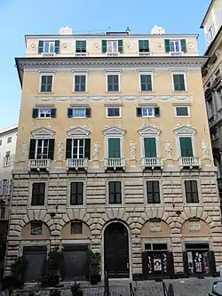 On the site of the present building, a construction for residential use had been erected, starting in the 15th century, consisting, according to medieval tradition, of two buildings side by side with underlying water cisterns and workshops.[1] The building stood at a crossroads, which in 1539 was to be transformed into a piazza by demolishing the surrounding hovels, at which time Cipriano Pallavicini, (elected in 1567 archbishop of Genoa) with his brothers Antoniotto and Gerolamo commissioned an author who has remained anonymous to design a new façade with a more modern façade and a design inspired by the Roman Palazzo Caprini by Donato Bramante.[2]