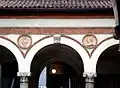 The courtyard is accessed through an entrance hall, which features the original Renaissance decoration consisting of frescoes covering the cross vaults, supported by carved corbels. The regular courtyard is opened by porticoes on the four sides of four arches each. The arches are supported by stone columns surmounted by composite capitals with acanthus leaves, which house horse-head plaques with coats of arms that are no longer legible. Above the arches runs a decoration of terracotta cornices and cords, restored to their surviving parts. Between the spandrels of the arches, a series of stone roundels alternates noble coats of arms with profiles of personages from the Sforza court.[3] In the centre, a sculpted well-curb, dating back to the 15th century.