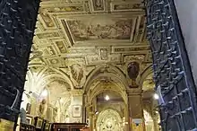 The large atrium on the ground floor opens completely with four arches towards the courtyard: pillars support the arches, similarly to the palazzo Cambiaso Pallavicini in Strada Nuova, today's via Garibaldi. The interiors preserve on the ground floor frescoes by Giovanni Battista Castello and Luca Cambiaso with a fantasy of grotesques and stucco-framed figurines, among which the two major episodesː the banquet for the Marriage of Cupid and Psyche and Cupid asks Jupiter for Psyche in marriage'.[4]