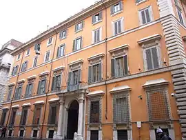 In 1859, with the extinction of the main line of the Giustiniani family, the palace became the property of the Grazioli, who leased it to the Grande Oriente d'Italia masonic order in 1898. The Grande Oriente made it their headquarters on 21 April 1901; initiates referred to the palace as the "Vaticano Verde" or the "Vaticano dei 33.".[1] In 1917 a person of unsound mind killed Achille Ballori, Grand Commander of the Scottish Rite and associate Grand Master of the Grande Oriente d'Italia in the palace.[2]