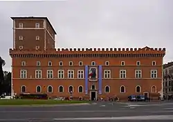 The Palazzo Venezia or Palazzo Barbo (Italian: [paˈlattso veˈnɛttsja]), formerly Palace of St. Mark, is a palazzo (palace) in central Rome, Italy, just north of the Capitoline Hill. The original structure of this great architectural complex consisted of a modest medieval house intended as the residence of the cardinals appointed to the church of San Marco. In 1469 it became a residential papal palace, having undergone a massive extension, and in 1564, Pope Pius IV, to win the sympathies of the Republic of Venice, gave the mansion to the Venetian embassy to Rome on the terms that part of the building would be kept as a residence for the cardinals, the Apartment Cibo, and that the republic would provide for the building's maintenance and future restoration. The palace faces Piazza Venezia and Via del Plebiscito. It currently houses the National Museum of the Palazzo Venezia.