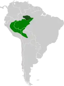The pale-winged trumpeter is found in the upper Amazon Basin of eastern Peru, northern and central Bolivia, and central-western Brazil south of the Amazon and west of the Rio Madeira. A single record in extreme southeastern Colombia has not been accepted by the South American Classification Committee of the American Ornithological Society.[8][9][3] The species inhabits dense lowland tropical rainforest. Within that broad category it favors landscapes away from human habitations. In elevation it ranges up to 750 m (2,500 ft).