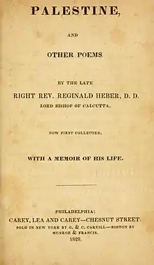 Montefiore, writing in 1902, described the poem as "the most successful and popular piece of religious verse of the first half of the [19th] century".[3] A later biographer, Derrick Hughes, finds its contemporary acclaim puzzling: "It is not a good, not even a mediocre poem; it is leaden".[4] In the United States it was published as Palestine and other poems, and also included memoirs of Heber's life.