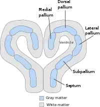 The general layout or body plan of the pallium is already clearly defined in animals with relatively simple brains, including lampreys, sharks and amphibians. In teleost fish, reptiles, birds, and mammals, the pallial architecture is greatly modified (sharply diverging in fish), with differential growth and specialization of diverse sectors of the conserved pallial Bauplan. In all vertebrate brains, the telencephalic forebrain consists of two hemispheres, joined at the midline by a region called the septum. The septum is continuous with the preoptic area across the plane defined by the anterior commissure; it is largely subpallial, but also contains a small pallial portion, where the hippocampal commissure forms, which is contiguous to the medial pallium. The telencephalic part of the rostral choroidal tela (roof plate continuous caudally with a diencephalic part) is inserted at the back of this commissure at a locus where mammals show the subfornical circumventricular organ, and extends laterally over the interventricular foramen into a wing-shaped medial telencephalic territory, the so-called choroidal fissure. Here the choroidal tissue is attached to the fimbria of the hippocampus (also known as the cortical hem area), bordering lengthwise the medial pallium. At its rostral and caudal ends, the medial pallium contacts the ventral pallium, which builds the pallial portion that contacts the subpallium across the pallio subpallial boundary, observed at the lateral telencephalic wall. Inside the ring formed thus by the medial and ventral pallium there is a sort of island that contains the dorsal and lateral pallial portions. In older literature the pallium used to be subdivided only into three zones, called the medial pallium, dorsal (or dorsolateral) pallium, and lateral pallium. The old lateral pallium encompassed the modern lateral and ventral parts of the pallium. The medial pallium is the progenitor of the mammalian hippocampus, and is thought to be involved in spatial cognitive mapping and memory formation across a broad range of species. The lateral and ventral pallium is the progenitor of the mammalian piriform cortex, and has an olfactory function in every species in which it has been studied. The evolutionary diversifications and specialization in functions of the dorsal pallium have been more difficult to decipher. It is widely believed to be the progenitor of the bulk of the mammalian cerebral cortex, although the evidence for this is considered by some anatomists not yet to be conclusive.[2] In mammals and birds, the dorsal pallium increased in size and became the predominant brain region for sensory processing and the end site of sensory consciousness, the hypothesized reason for which is because of the nocturnal and burrowing lifestyle of ancestral mammals and the arboreal and volant lifestyle of ancestral birds.[3]