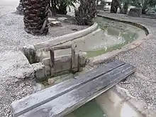 The Caliphate of Córdoba constructed a comprehensive canal system for urban consumption, industrial production, and crop irrigation. Islamic rulers regarded water as a social good and designed the canal system to maximize water conservation.[14] With over 20 branches, the main canal Acequia Mayor channeled the brackish water from the Vinalopó River through secondary channels and partidores to crop fields.[15] Upon reaching partidores north of Elche, the water flow split into the partidor de Albinella and the partidor de Marchena. The partidor de Albinella diverted water into Elche for urban consumption and industrial production. The partidor supplied small industries (i.e., oil and soap producers), bathhouses, and local markets.[16] The partidor de Marchena within the Acequia Marchena channeled water to the right side of the Vinalopó River. The Acequia Mayor on the left side of the Vinalopó River stretched south across Elche to the crop fields.[16] Elche residents cultivated crop fields for human and livestock consumption as well as sale in local markets.[17] The Acequia Mayor ended at a partidor channeling excess flow into two reservoirs. The canal system was maintained under Islamic rule until the Christian Reconquista.