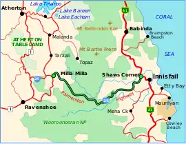 The highway splits from the Bruce Highway in Goondi just north-west of Innisfail (17°30′52″S 145°59′37″E / 17.51432°S 145.99374°E). It then winds through the Wooroonooran National Park to the township of Millaa Millaa, with no major road junctions. It terminates at an intersection with Old Palmerston Highway (now called Beatrice Way)[2] and Main Street (17°30′48″S 145°36′47″E / 17.51328°S 145.61310°E).[2] Its total length is 54.6 kilometres.[3]