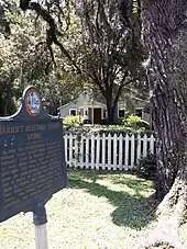 In the late winter of 1867, Stowe followed her son to Florida, finding that the warmer weather allowed her to spend more time on two novels she was writing. Her first weeks in Orange Park utterly transformed her and she became enchanted with Florida at once,[13] writing that she felt she had sprouted wings and become "young & frisky".[14] She accompanied her son one day to collect the mail, which was deposited in Mandarin, about 3 miles (4.8 km) across the St. Johns River. They rowed to the eastern shore and Stowe fell in love with a cottage in Mandarin, attached to an orange grove. Stowe's transformation in Florida was rooted in her identification and familiarity with Puritan New England: industry and thrift in a climate where cold sharpened one's senses and values. The laid-back attitude of the people and warmth of the Southern climate were seductive. She at first attempted to persuade her brother Charles to purchase the land in Mandarin, writing to him and asking "How do you think New England theology would have fared had been landed here instead of Plymouth Rock?"[1] She wrote about the land and climate intoxicating her and pondered the effect it might have had on literature when she posed an idea to her publisher: "I hate to leave my calm isle of Patmos—where the world is not and I have such quiet long hours for writing. [Ralph Waldo] Emerson could insulate himself here and keep his electricity. [Nathaniel] Hawthorne ought to have lived in an orange grove in Florida."[15]
