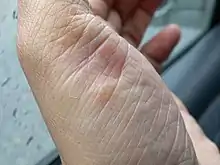Pustulosis palmaris et plantaris is a chronic recurrent pustular dermatosis (that is, a pustulosis or pustular psoriasis) localized on the palms and soles only, characterized histologically by intraepidermal pustules filled with neutrophils.[2]: 411, 628 [3]: 204 It can occur as part of the SAPHO syndrome.[4]