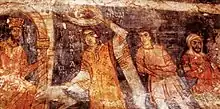 The Festival of Herod II stands out among the scenic representations. The fresco shows the king on his throne, pointing at his wife, Herodias, as she presents him with the head of John the Baptist on a platter. Further scenes show the Miracles of Jesus, the Resurrection, and the birth and death of the Virgin Mary. All these paintings are outstanding due to their lively expression and harmonious colouration.[9]