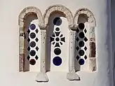 To left and right of the central door are two permanently installed fields consisting of upright flat marble slabs inlaid with an unusual Intarsia technique, with geometric and floral motifs cut into the marble in relief. The pictures are from the Arab tradition and are supplemented by small birds, swastikas, flowers, palmettes and leaves. The wells of the reliefs were originally filled with a red, now darkened mass of wax and mastic. In the same technique, marble inlays are also mounted on the pillar trim, connecting panels and the door lintels. Two icons are also embedded above the lintels. On the left side of the door, the Panagia is depicted with the Child Jesus. To the right of the central door is the Christ Pantocrator with the right hand in a sign of blessing and the left holding a closed Evangelion. These two icons are modern creations which took the place of 17th century icons which were stolen in 1982.[5]