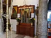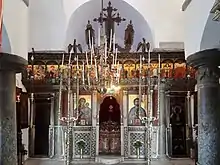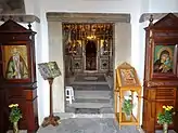 The iconostasis, which separates the eastern end of the main hall of the church from the chancel (called the "bema" in Orthodox tradition), is notable for its brilliantly multicoloured effect.[2] It has the usual five-part structure. The lower part consists of the original furnishings from the construction of the church around 1100. The upper part consists of an engraved wooden post-Byzantine architrave, a frieze with fourteen icons and a carved top.[3] The variety of ornaments is considered unique in the Middle Byzantine Era, with links to the 6th century[2] and to churches in Constantinople, Venice and Ravenna.[4]