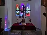The east-facing cross-arm of the church contains the altar, and also contains a half-round apse that is recognisable from outside. The apse contains a mullion which, like the two smaller windows next to the apse, is filled with colourful glass bricks. The red, green, yellow and blue glass bricks provide the only exterior light into the chancel, that is otherwise only lit through the opened doors of the iconostasis, or through it from the inner part of the church. North of the chancel, at the Northeast side of the building, is a narrow bell-gable with four bells that can be rung from outside using bell ropes.