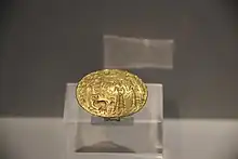 Schliemann left many finds partially exposed in the ground, and several trenches unfinished.[67] Stamatakis returned to Mycenae early in January 1877.[68] Following the observation of a trench to the south side of the Grave Circle, Stamatakis excavated and discovered, along with Vasilios Drosinos, Schliemann's surveyor,[44] the remains of the so-called "Ramp House", including a treasury of gold vessels, jewellery and a signet ring.[69] This assemblage, known as the "Acropolis Treasure", has been interpreted as the contents of a looted shaft grave.[44] Much of its material was imported, showing connections between Mycenae and Central Europe.[69] Another major project undertaken by Stamatakis in this period was the systematic photography of the finds and remains at Mycenae.[70]