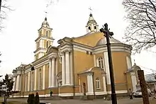 In 1860, bishop Motiejus Valančius began preparations for construction of a new church in Panevėžys. However, after the Uprising of 1863, the Tsarist authorities implemented Russification policies, including the Lithuanian press ban and suppression of the Catholic Church. The authorities forbade construction of any new Catholic churches and closed the Piarist church leaving only the Church of Saints Peter and Paul to service the Catholic inhabitants of Panevėžys.[2] A permission for construction was obtained in 1904, but the work was delayed by the Russo-Japanese War and the Revolution of 1905 until 1908. Until World War I, a rectory and a temporary chapel were completed while church's walls rose up to the windows. The church was to be named after Saint Stanislaus the Martyr.[2]