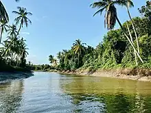 The mouth is located 52 kilometres (32 mi) south of Tanga.[7] The river is tidal for a distance of 22 miles (35 km) from the entrance.[11] The southern side of the entrance is marked by a perpendicular bluff named Bweni, about 200 feet (61 m) high; there is a village of the same name, Bweni, situated here. The northern side of the entrance is a flat sandy beach that extends from the head of the bay. There are several settlements at the entrance, two on the northern and two on the southern bank. Historically, the town of Pangani, on the river's left bank, had a reputation for fevers.[13] At its estuary, by Pangani town, the river is about 600 feet (180 m) in breadth, and 12–15 feet (3.7–4.6 m) deep.