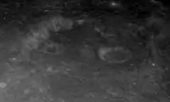 This is a worn and eroded crater, although the perimeter of the rim is still visible. The southern part of the interior floor is jumbled and irregular. There is a small crater next to the inner wall along the west-southwest part of the floor. A smaller crater also lies in the interior along the northeast inner wall. There are also several small craterlets on the floor.