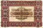 5 korona | 132 × 80 mm | Male model | "Bill of the Hungarian Postal Savings Bank" | 6 June 1919 | 28 January 1923 |