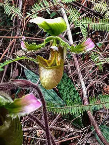 Paphiopedilum robinsonianum is a species of slipper orchid endemic to Sulawesi, Indonesia, where it is known from two mountains in the regency of Central Sulawesi. It is restricted to tropical montane forest habitat at approximately 1400 metres altitude.[1]