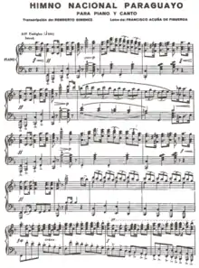 It still remains unclear who was responsible for the creation of the music. Some sources claim that Frenchman Francisco Sauvageot de Dupuis was the composer, while others claim it to be the work of the Hungarian-born Francisco José Debali (Debály Ferenc József), who composed the music for the Uruguayan national anthem.[1] What it is known for sure is that it was the Paraguayan composer Remberto Giménez who in 1933 arranged and developed the version of the national anthem that remains in use by Paraguay today.